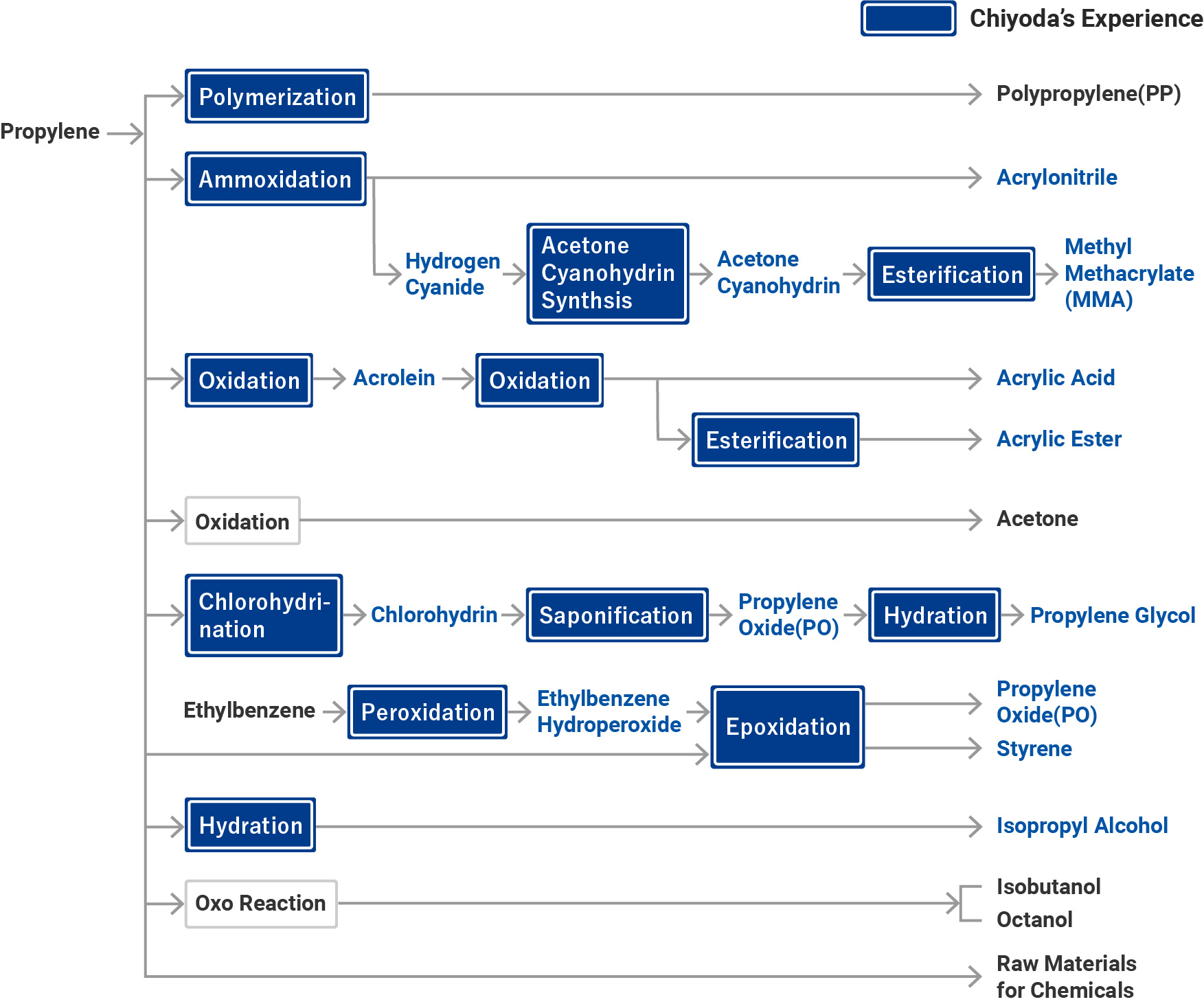 Chiyoda has constructed plants for propylene derivatives such as propylene glycol and acrylic acid.