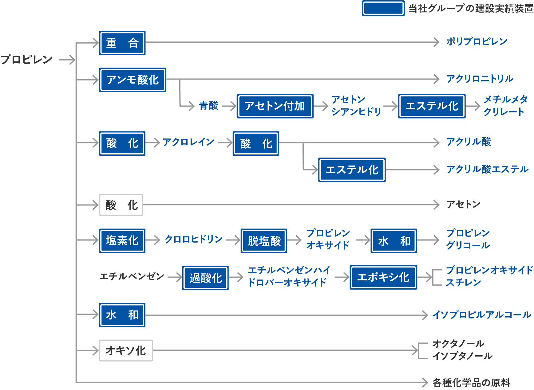 またプロピレングリコールやアクリル酸等の、プロピレン誘導品のプラント建設を手掛けています。